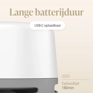 Der integrierte wiederaufladbare Akku mit 2000 mAh bietet bis zu 20 Stunden Nutzungsdauer, abhängig von der Lautstärke und ob das Nachtlicht eingeschaltet ist.