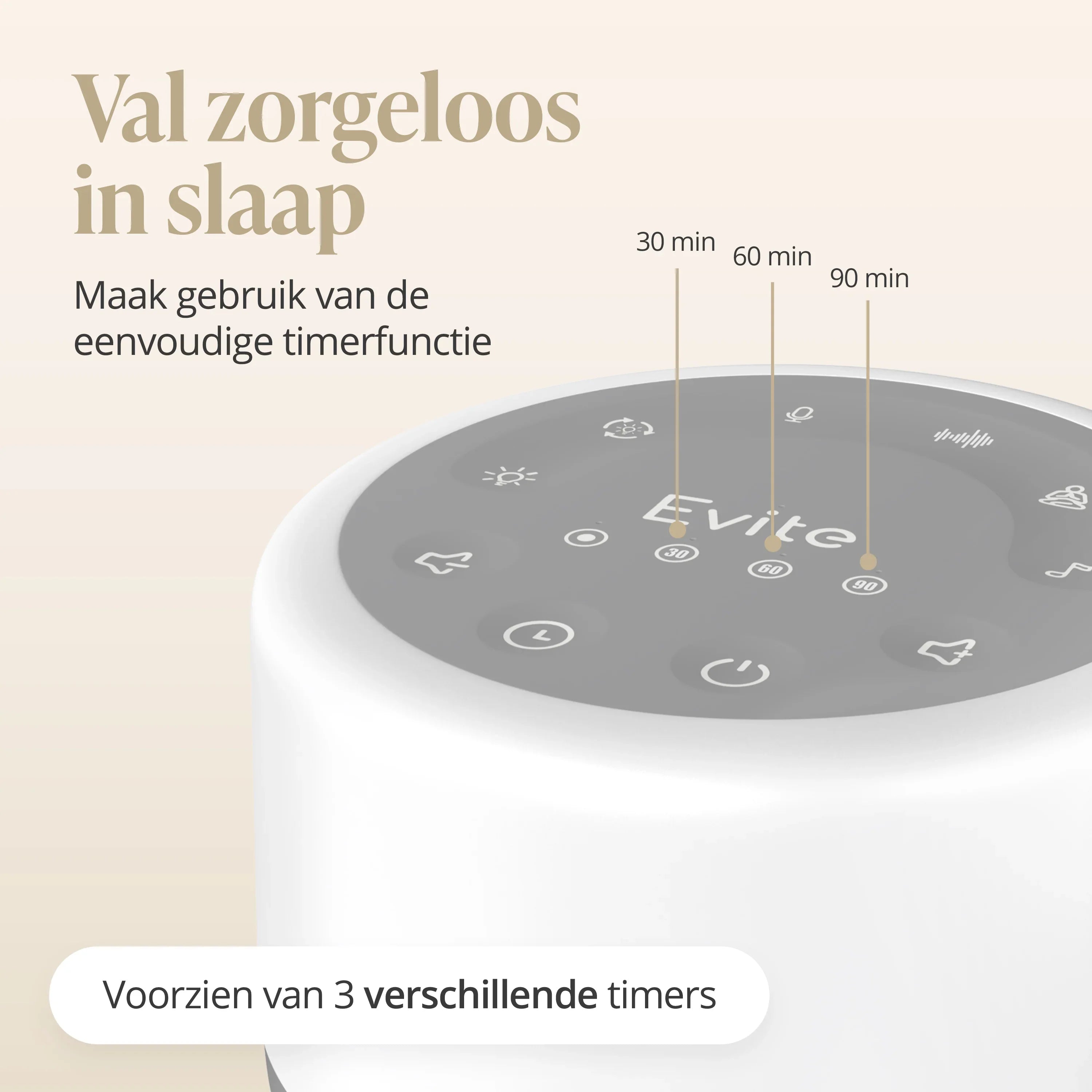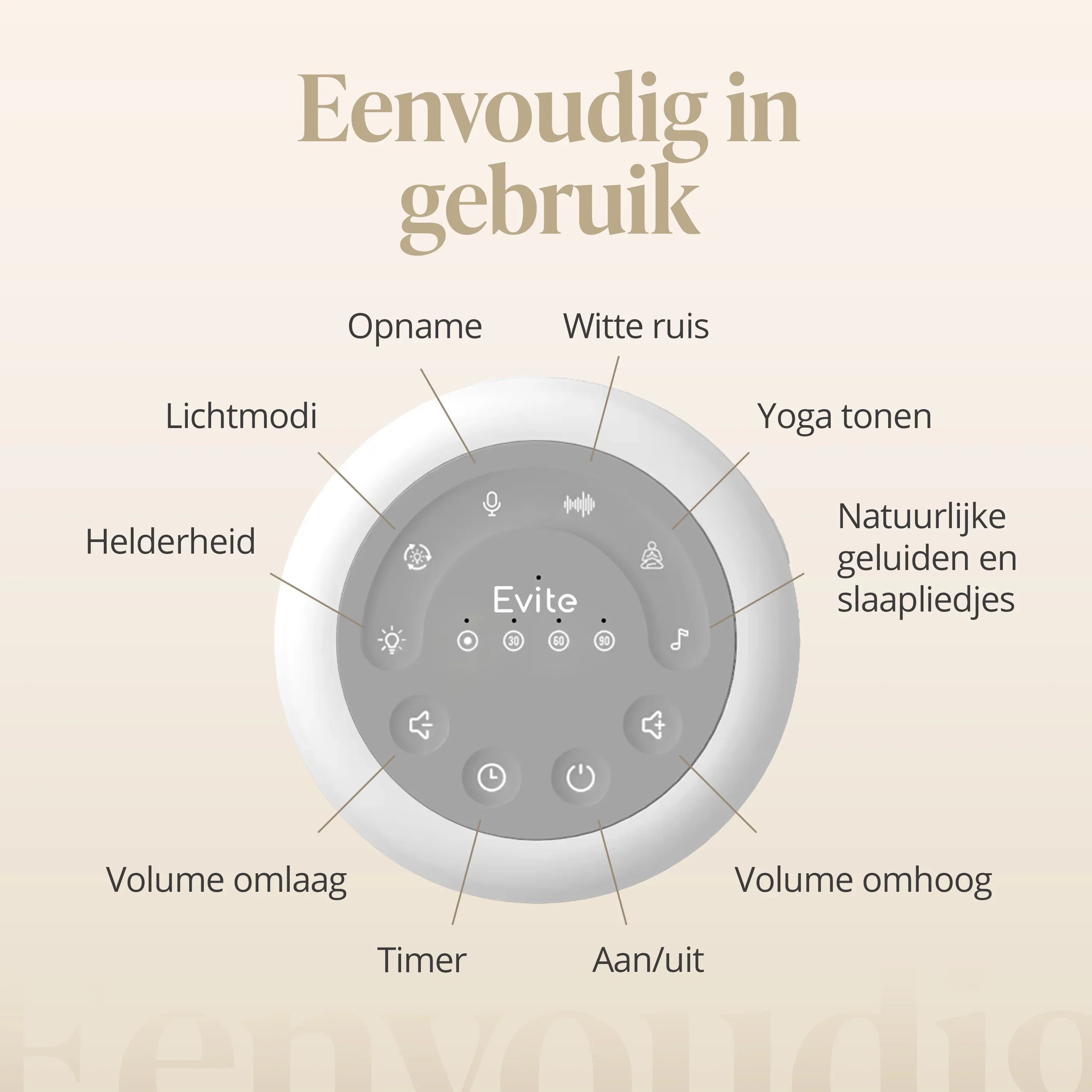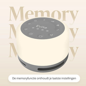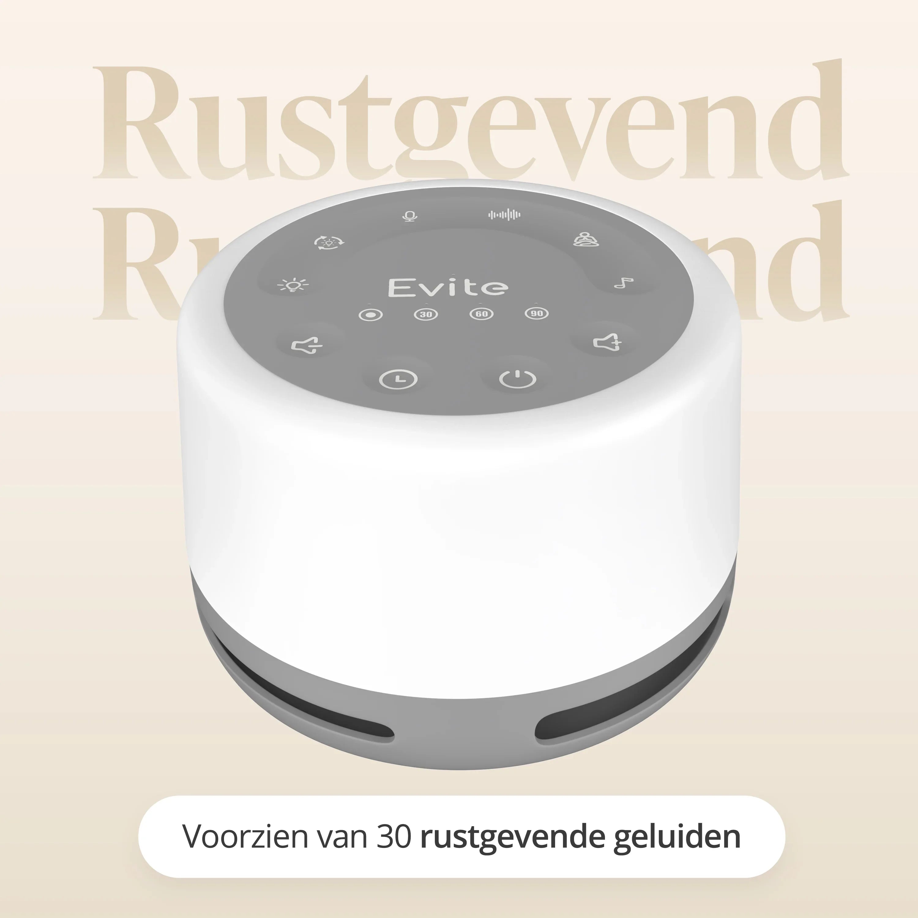De Evite White Noise Machine helpt je baby sneller en dieper slapen. Met 30 rustgevende geluiden, zacht nachtlampje en lange batterijduur. Voor thuis en onderweg.